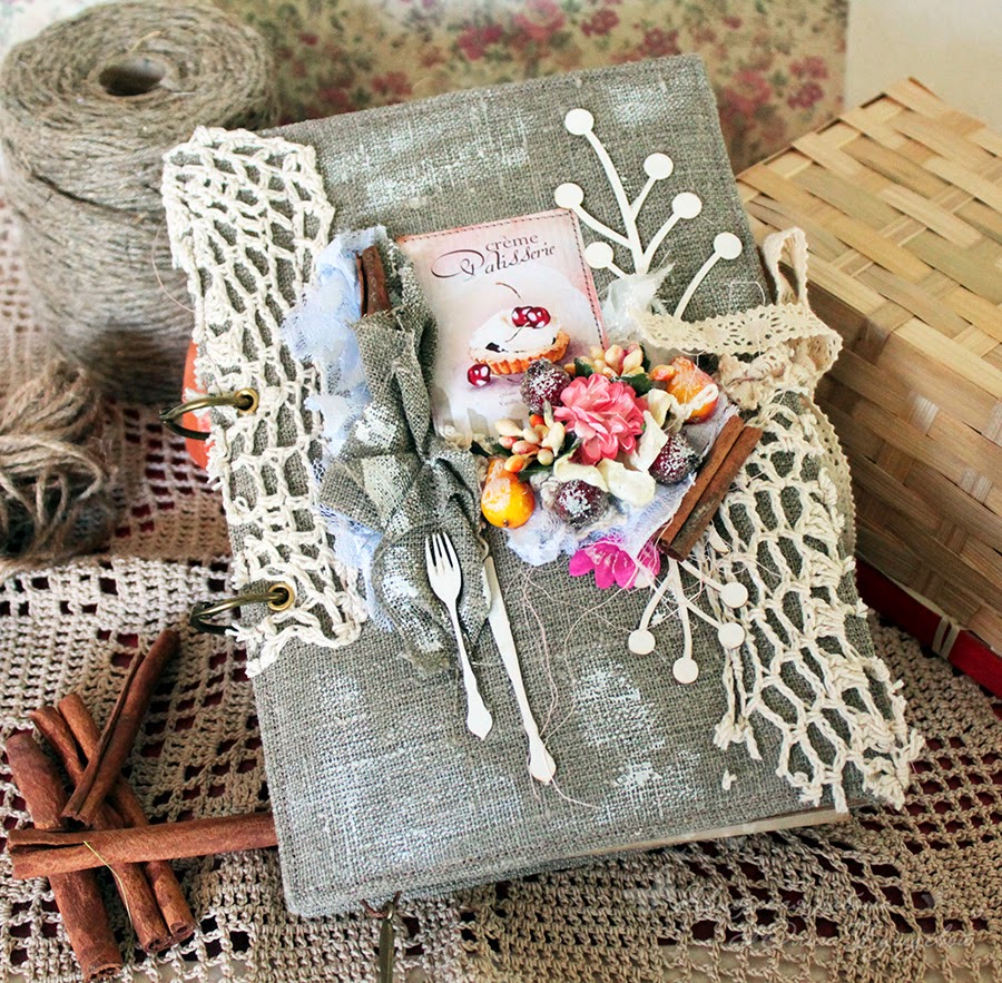 У меня кулинарная книга. Использовала много кружева, цветы, ягодки, подвески, чипборд, высечки, палочки корицы, ягодки и плоды, акриловая краска.