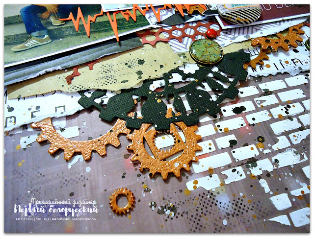 По нашей доске у меня получился мягкий блокнотик с миксд-медийным фоном, который я украсила вырубкой, чипбордом, металлическими элементами, отштамповками, журналлингом...