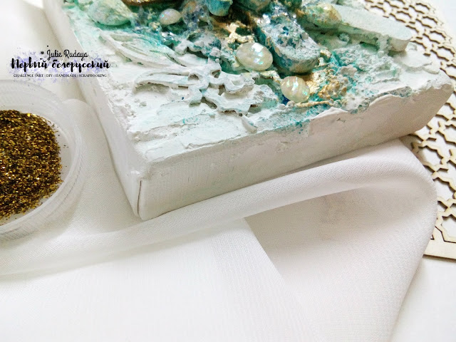 А в целом холст мне помогали создавать меловая пыль от Myhobbypoint и деко-топпинги: блеск-слюда "оттенки моря" и золотая пудра.