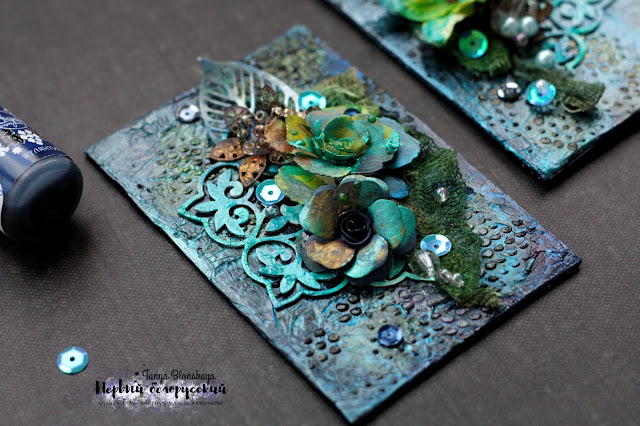 Лак-акценты всё же дают довольно прозрачный цвет, который на черном фоне практически не заметен. Зато трещинки были великолепны. Ну не выбрасывать же! Достала весь свой арсенал красок и с их помощью начала проявлять полученную фактуру и трещинки, втирая всевозможные "перламутры" и "хамелеоны".